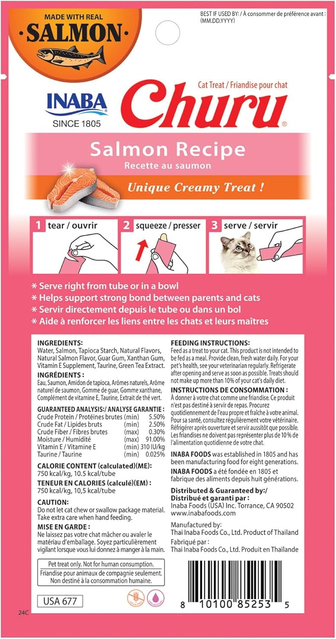 INABA Salmon Churu Cat Treats, Lickable, Squeezable Creamy Purée Cat Treat with Green Tea Extract & Taurine, 0.5 Ounces Each Tube, 24 Tubes (4 per Pack), Salmon Recipe
