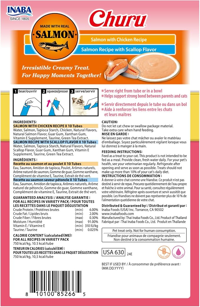 INABA Salmon Churu Cat Treats, Lickable, Squeezable Creamy Purée Cat Treat with Green Tea Extract & Taurine, 0.5 Ounces Each Tube, 20 Tubes, Scallop & Chicken Variety Box