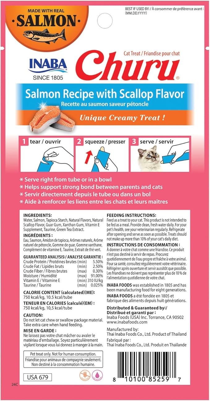 INABA Salmon Churu Cat Treats, Lickable, Squeezable Creamy Purée Cat Treat with Green Tea Extract & Taurine, 0.5 Ounces Each Tube, 24 Tubes (4 per Pack), Salmon Recipe with Scallop Flavor