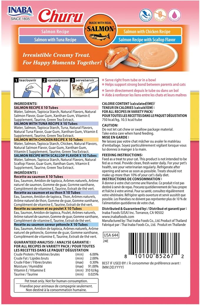 - MADE WITH WHOLESOME INGREDIENTS YOU CAN TRUST: Every Inaba product is made with yummy high-quality ingredients including real chicken, wild-caught tuna and now Norwegian Salmon