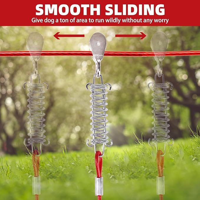- SHOCK-ABSORBING BUFFER SPRING: Our dog trolley system's spring is located on the 75ft Cable, reducing tension and absorbing the shock of quick movement to a greater extent when tugging, releasing the impact force to the outside, keeping your puppy feel ease and secure while reducing the frequent pulling and wear of the rope and increasing its service life