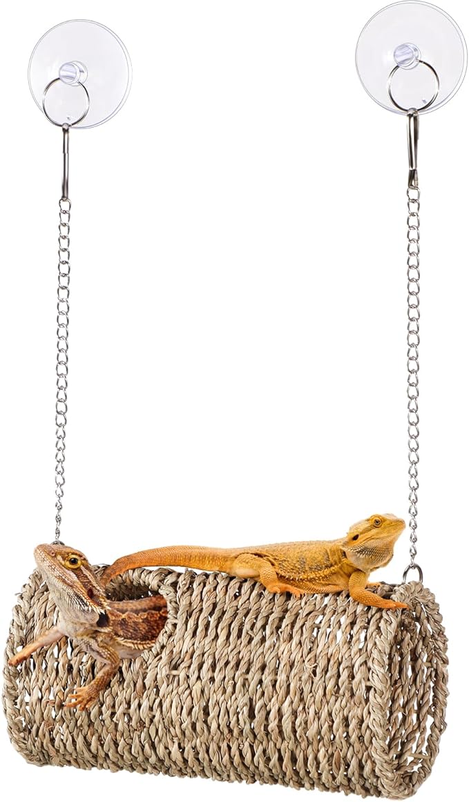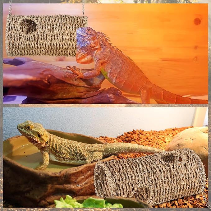 Reptile Hide Cave Hollow Cave Hideout with 2 Pcs Suction Cup and Chains Gecko Hide Reptile Tank Decor Seagrass Fiber Climbing Toys for Lizard Snakes Hermit Crabs(Long Cylindrical)
