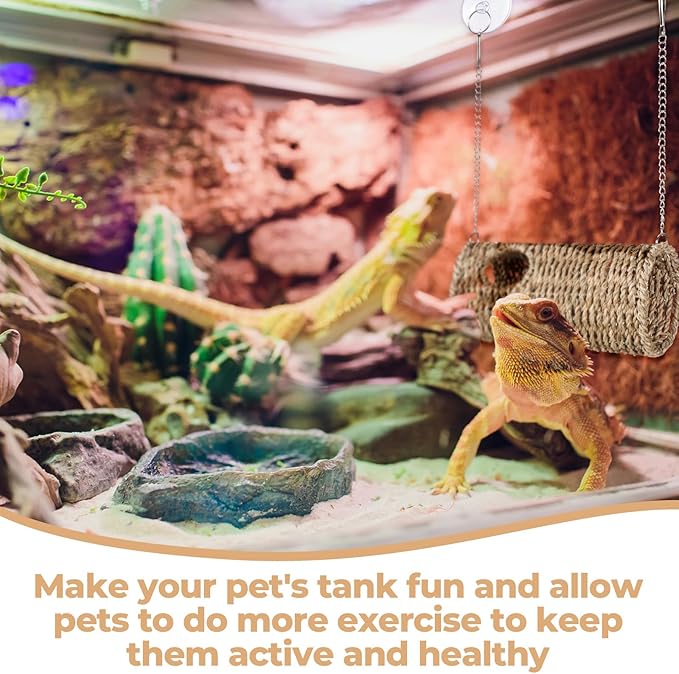 - Size Detail: the reptile tank decor is 7.68" long with a diameter of 3.74", featuring two 2.36" diameter holes, while the chains are 7.87" long, and the suction cups are 1.97" in diameter; Size variations are possible since it is handcrafted from straw