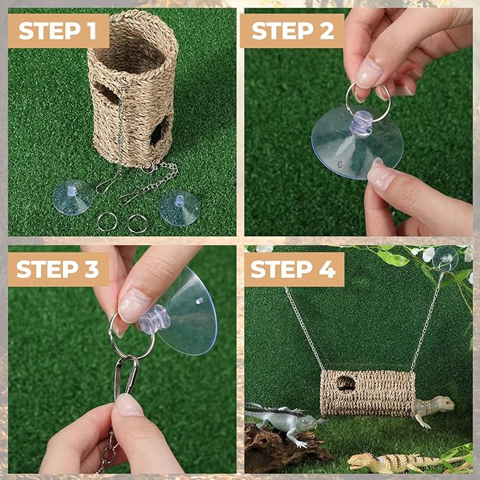 - Material: the reptile hide cave is made of straw, ensuring a natural and safe space; The plastic suction cups and metal chains can secure the cave onto glass or acrylic surfaces; You can modify the cave's setup to suit your pet's habit and comfort