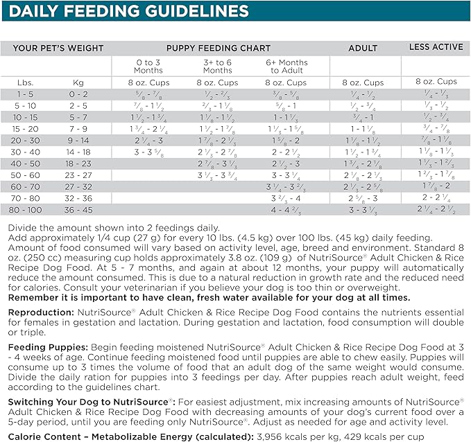 - As a member of our grain inclusive series, NutriSource Chicken and Rice Dry Dog Food is formulated to meet AAFCO guidelines for all lifestages