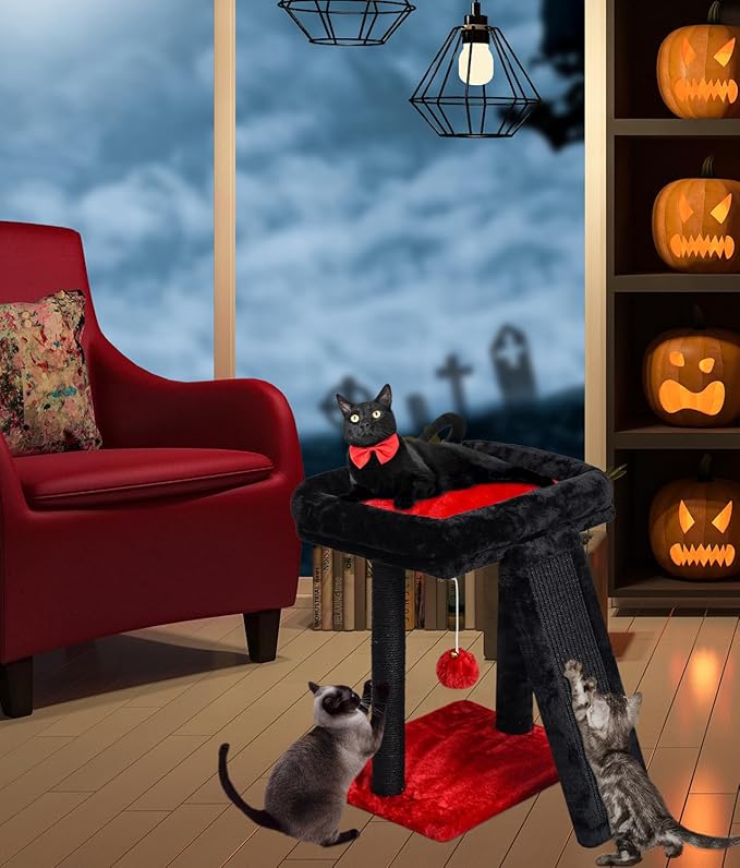 SYANDLVY Small Gothic Cat Tree for Indoor Cats, Scratching Board with Perch, Cat Scratching Post for Adults, Cat Post Scratcher, 2 Dangling Balls Great for Kittens