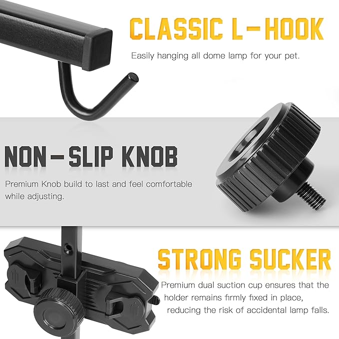 - 【Adjustable】The vertical rod can be adjusted to 15.9-27.6’’, and the horizontal rod can be adjusted to 9.05-11.22’’. Flexibly controlling the optimal distance between the heating lamp and the reptile.