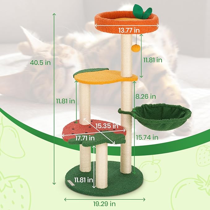 - Whimsical Fruit World Theme: The Happy & Polly Cute Cat Tree features a stylish and playful fruit-themed design that adds a touch of charm and fun to your home decor. Standing at 40.5 inches tall, it provides your indoor cat with plenty of space to explore, lounge, and relax in style.