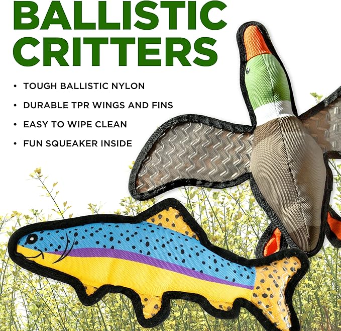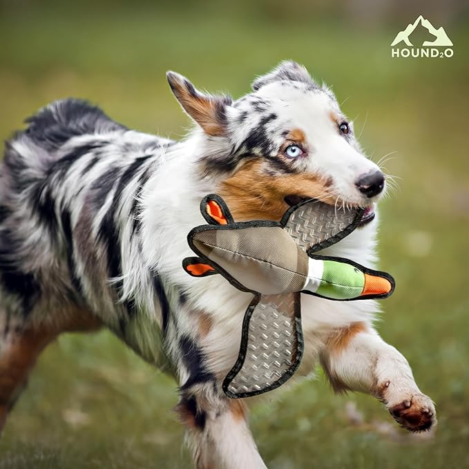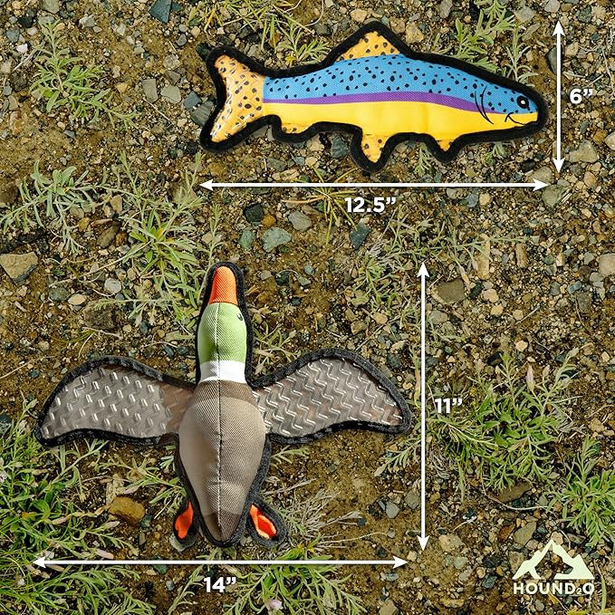 - Hound2O’s Flying Duck & Trout Plush 2-Pack – This 2- pack is perfect for dogs who love both flying and finned friends! Featuring a lifelike flying duck and trout, both made from rip-resistant ballistic nylon, with raised TPR details and engaging noise features. These toys will keep your pup entertained on every adventure, whether they're chasing, chewing, or wrestling their favorite prey! The ultimate catch for hounds of all sizes who love to play outside!