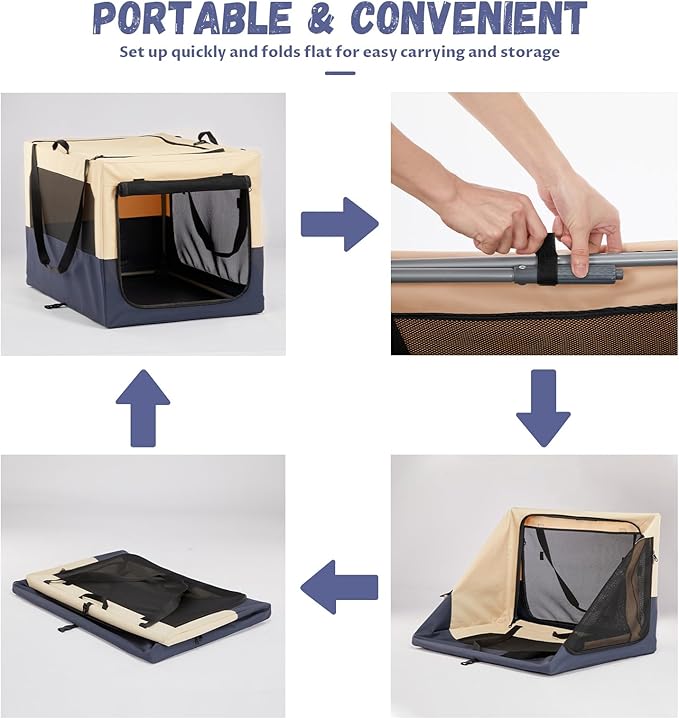 - We've also designed our soft dog crate with your pet's safety and convenience in mind. With front and one-side doors equipped with lockable zippers that can be rolled up and fixed with fabric-magic tapes, your furry friend can safely enter and exit the crate.