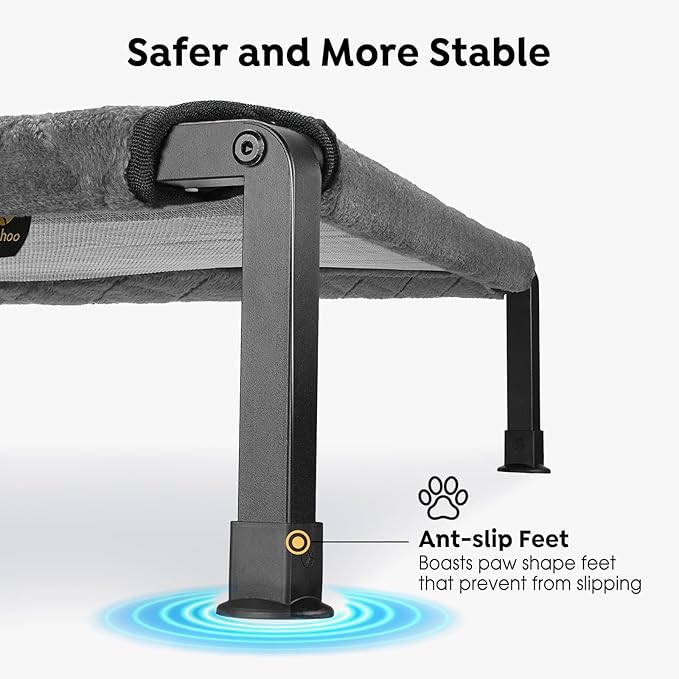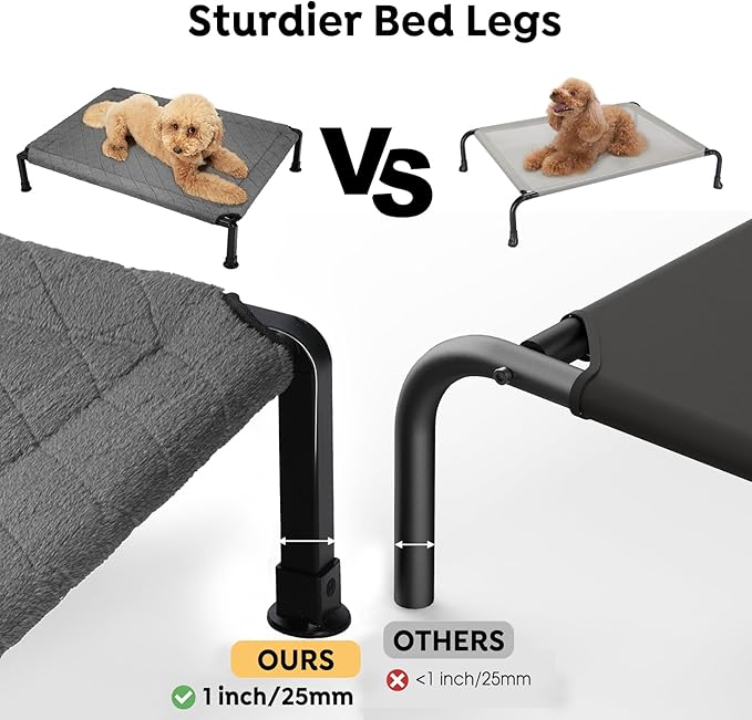 - Enhanced Durability: One Piece Tubing Sturdy Design resists bending, and the heavy-duty frame is thicker than other normal beds, ensuring lasting durability. With anti-slidding silicon feet, this elevated dog cot offers superior stability, making it a safe and reliable choice for even the most active pets.