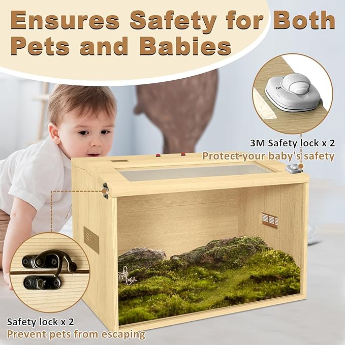 - Safety for reptiles: Our lizard tank is made with thickened materials to ensure stability and durability. It is equipped with bronze locks and child safety locks as optional features, ensuring extra safety and preventing pet escapes. These safety features make it suitable for households with babies and other pets. Choose Nalwort, the preferred choice for happy reptiles