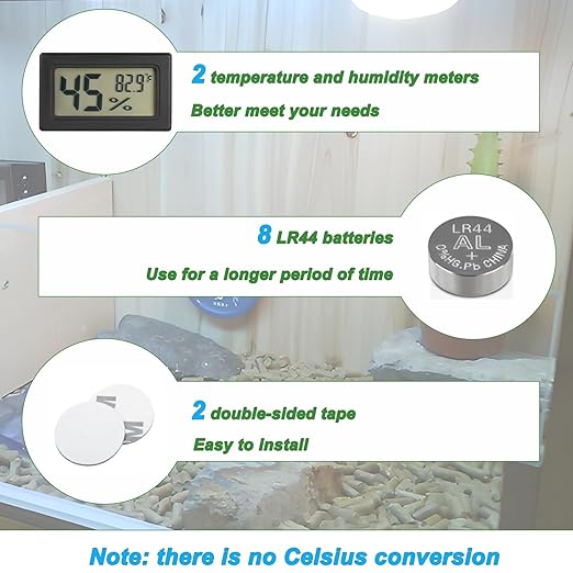 - 【Long Service Life】To ensure your long-term use. In addition to the built-in 2 batteries in the hygrometer(canbe used for 4 months). Two spare batteries are also included in the package for each reptile hygrometer. After the built-in battery is depleted,Spare battery,can be replaced.If you encounter any problems during use, please contact us promptly for resolution