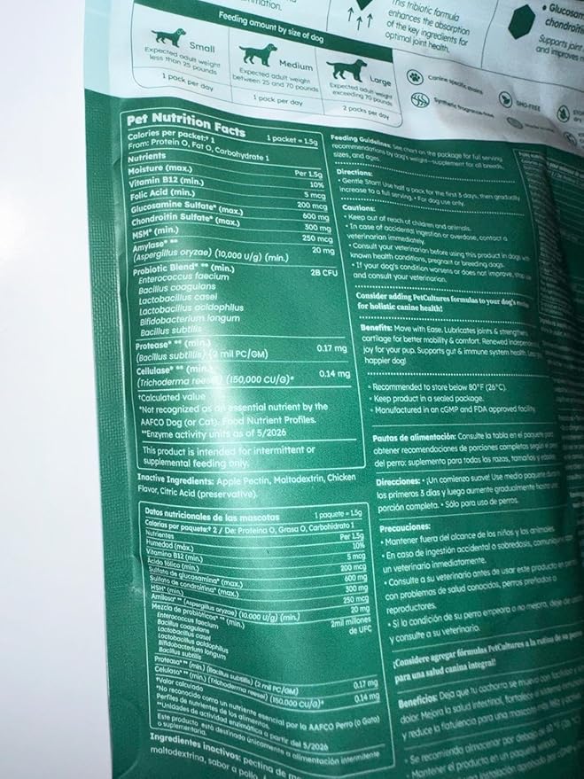 - High-Concentration Structural Ingredients: This formula is characterized by its high quantity of three key ingredients. Each 1.5-gram pack delivers 600 mg of Glucosamine Sulfate, 300 mg of Chondroitin Sulfate (from a porcine source), and 250 mg of MSM (Methylsulfonylmethane). These specific, clearly stated amounts allow the pet owner to know the exact dosage their dog is receiving, a critical factor for those who research and compare products.
