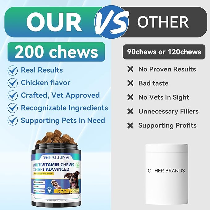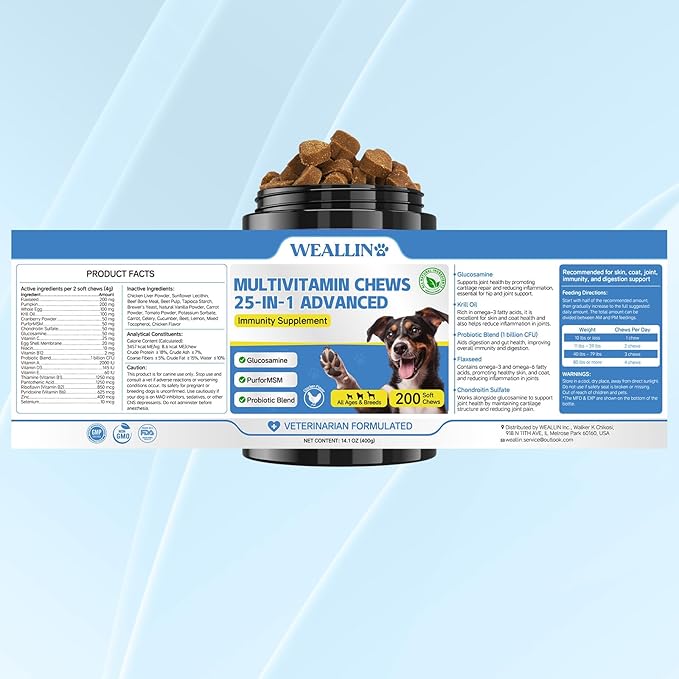 - Boost the Immune System: WEALLIN vitamins for dogs boost your furry friend's defenses! Enriched with natural minerals like vitamins A-E, zinc, and selenium, our dog vitamins multivitamin support a strong immune system to ensure your dog stays healthy and active at all stages of life.