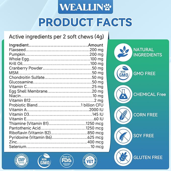 - Striving for Excellence: At WEALLIN, we are committed to protecting your pet's health with the highest quality, purest products to enhance their health and well-being. Our mission is to create comprehensive health solutions that ensure your dog thrives and help them become your most loyal companion.