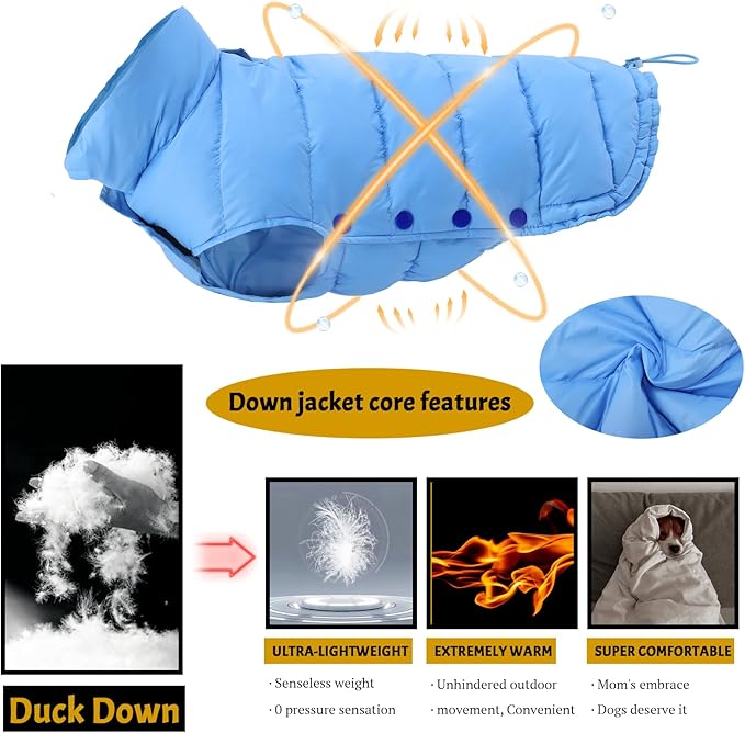 - 【SGS Certified High-Performance Warmth】 Filled with natural duck down, this dog puffer jacket is certified by SGS A-level for high-performance warmth. Its 5-layer structure ensures lightweight insulation, windproof, and water-resistant protection, perfect for extreme cold weather.