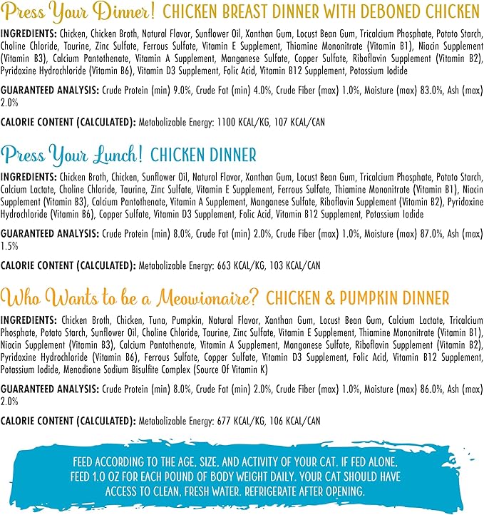 - Weruva Wet Cat Food, The Chicken Lounge Paté Variety Pack 5.5oz, Pack of 12 includes four (4) of each: Press Your Lunch, Press Your Dinner, Who Wants to be a Meowionaire.