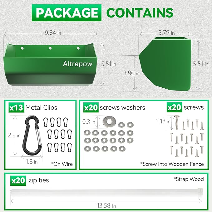 - EASY TO INSTALL AND CLEAN: We will provide three hanging methods of clips, nylon ties and screws for you to install the feed troughs. The feed trough can be hung on the wire fence or mounted on the wall or wood fence. And you only need to use a brush and water to clean the fence feed trough.