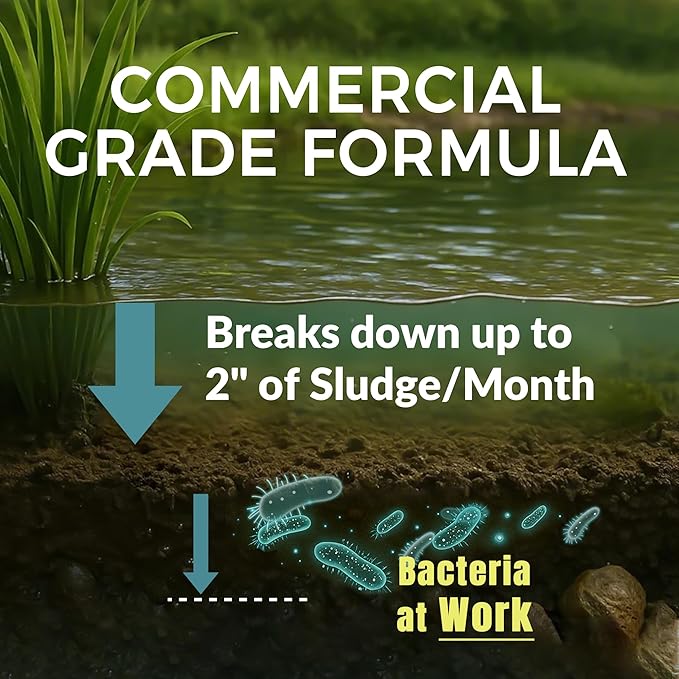 - Premium Sludge Solution for Ponds & Shoreline Defense – Specially formulated pond tabs sink to the bottom, continuously breaking down built-up debris like muck reduce products. One dose of 5lb treats up to 30,000 sq ft, every 4 weeks in water temperatures above 50°F.