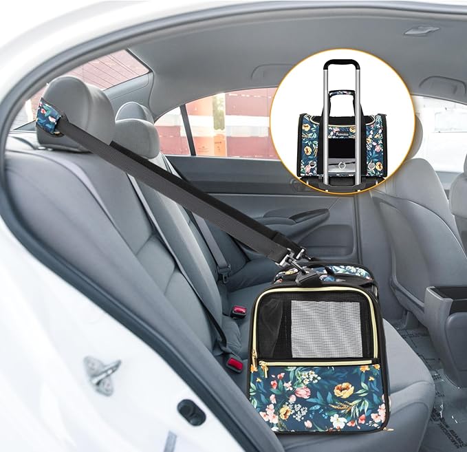 - Material & Pockets: Cat travel carrier is made of sturdy nylon with adorable floral pattern, unique and stylish. There are two pockets: the side pocket with zip closure for cat treats storage; the other on the back for phone, cards. Comes with shoulder strap and a built-in safety belt.