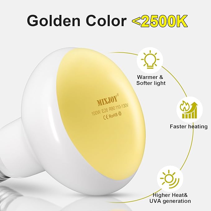 MIXJOY 2Pack Reptile Heat Lamp Bulbs 100W, 60% Intense Heat Bulb UVA Daylight Basking Spot Bulb for Reptiles, Turtle, Lizard, Tortoise, Bearded Dragon, Gecko, Chicken