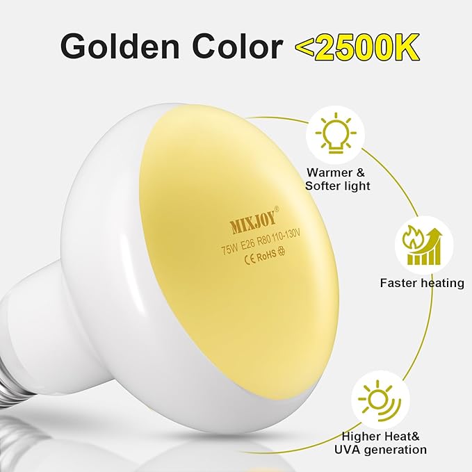 MIXJOY 2Pack Reptile Heat Lamp Bulbs 75W, 60% Intense Heat Bulb UVA Daylight Basking Spot Bulb for Reptiles, Turtle, Lizard, Tortoise, Bearded Dragon, Gecko, Chicken