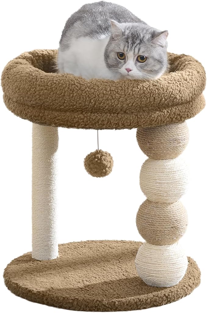 YOCAN Small Cat Tree Tower Indoor with Large Cozy Plush Top Perch, Natural Sisal Scratching Posts, Interactive Dangling Ball Great for Kittens and Cats (Brown)