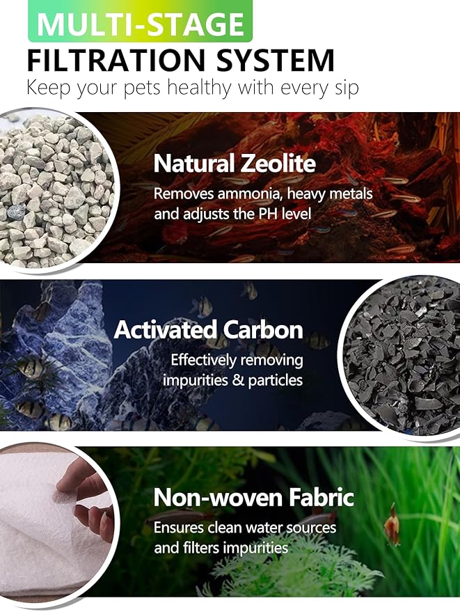 - Multi-Filtration System: The filter cartridge for fish and turtle tank utilizes coconut shell activated carbon (not ordinary carbon) and processed zeolite to effectively filter and absorb impurities, particles, and excrement in the water.