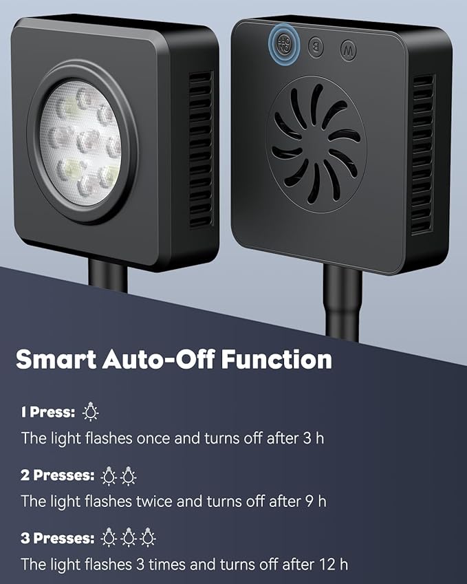 - Touch-Control: Simply hold “ON/OFF” for 3 seconds to activate the saltwater aquarium light. Once on, press “ON/OFF” once, twice, or 3 times to set the light to turn off automatically after 3, 9, or 12 hours. Smart timing for effortless lighting management