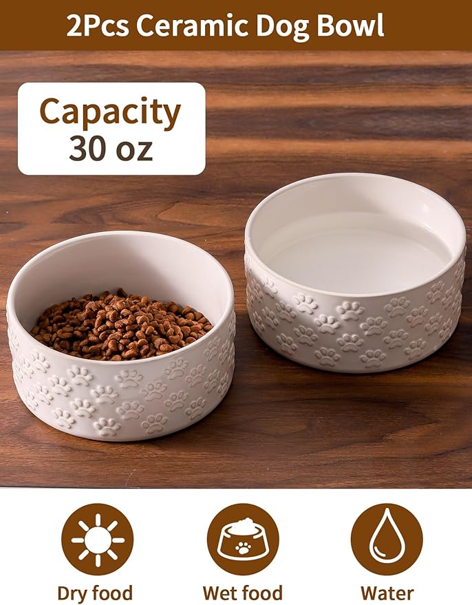 UBEE Ceramic Dog Food Bowl Set of 2, 6.1 inch Dog Dish Bowl with Paw Pattern, Pet Food Water Dish Feeding for Small and Meidum Dogs and Large Cat, White