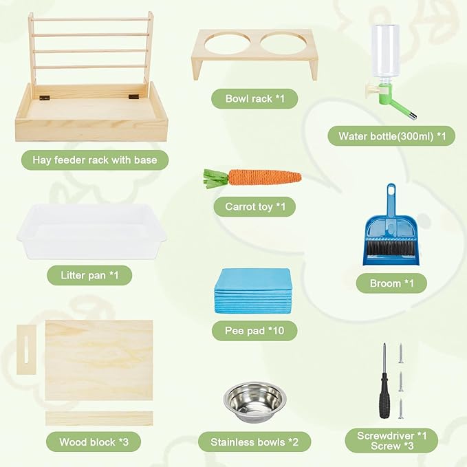 - More details: Our rabbit litter box with hay feeder offers a space for your furry friend to eat and a safe place to use the restroom, while keeping their living area neat and organized. The bunny litter box with hay feeder includes a wooden hay feeder rack, two feeding bowls, a 300ML water bottle, a litter pan, 10 pee pads, a broom, and a carrot toy - all of the essentials in one easy to install design.