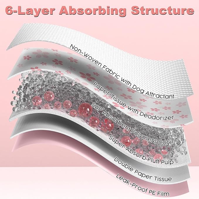 - Advanced 6-Layer Dog Pee Pads: MIZOK pink puppy pads jumbo size feature unique 6-layer structure for fast absorption and floor protection; the top non-woven fabric layer absorbs quickly, while the super absorbent polymer core holds 12 cups of liquid and locks liquid into a gel