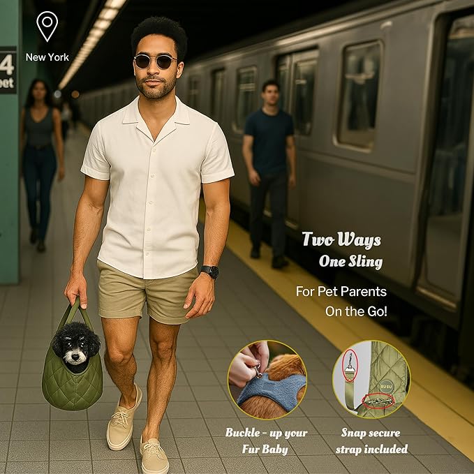 - Our Olive Green small dog sling is a sleek, hands-free carrier bag that keeps your pup close and comfortable on walks, errands, and travel, with a padded strap and roomy pockets.