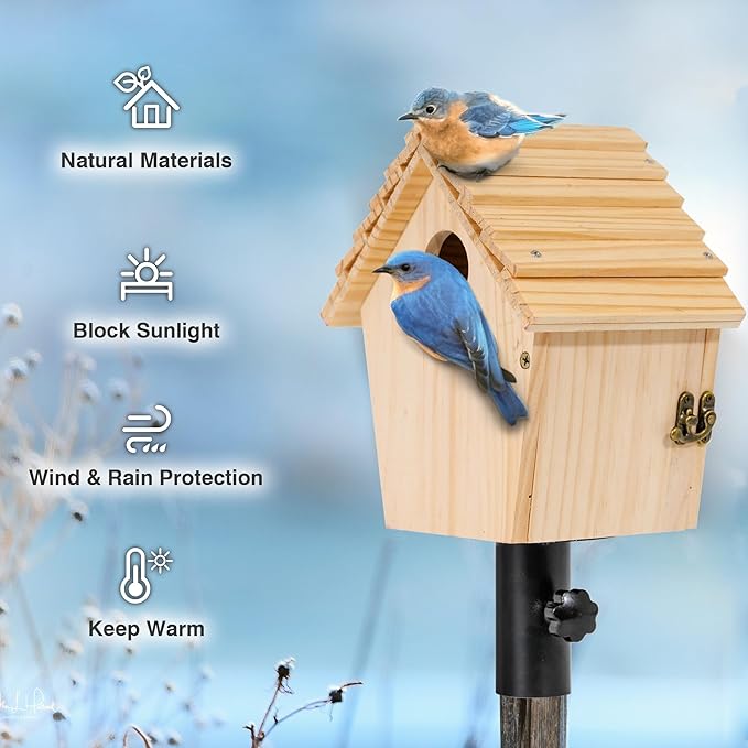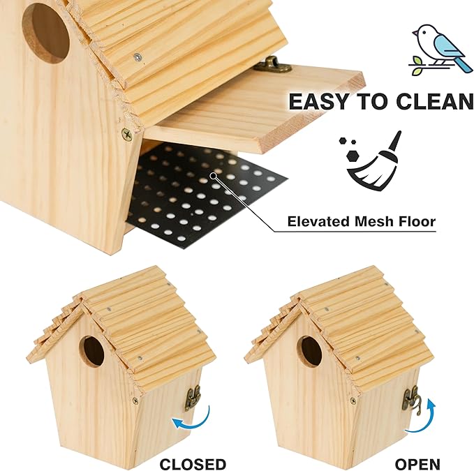 - Weatherproof & Bird-Safe Design – Ventilated roof, drainage holes, and an elevated mesh floor prevent moisture buildup, deter pests, and keep nests dry year-round.