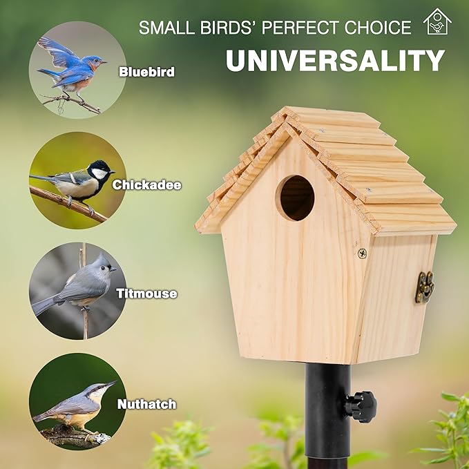 - Ideal for Small Birds – 1.5” entrance hole attracts bluebird, wren, titmice, finch, swallow, brown-headed nuthatches and chickadee while excluding predators. Natural wood finish blends into outdoor settings.