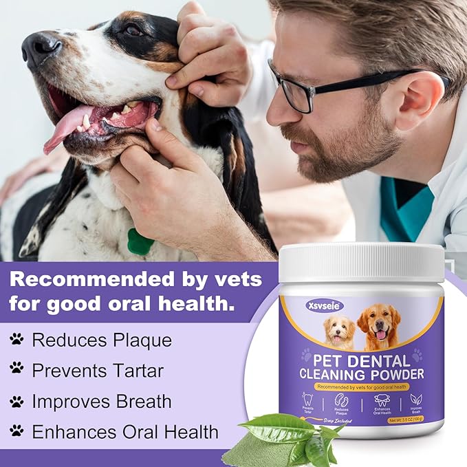 - Safe & Reliable: Our canine cleaning poder formula has been carefully reviewed by veterinary professionals andincorporates a blend of probiotics, green tea, and brown algae toeffectively combat tartar buildup and unpleasant odors. Say goodbye to the hassle of toothpaste, brushing and sticks with our green tea flavordog dental powder.