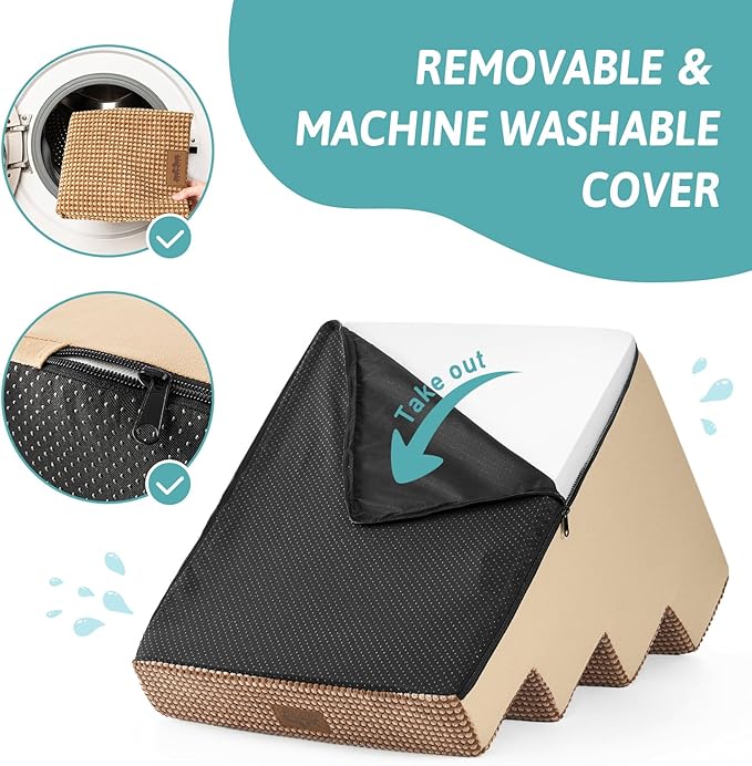 - Non-Slip Base and Removable Cover: Our dog steps for beds are equipped with a non-slip base featuring rubber dots for extra grip, minimizing movement during use. The pet steps cover is waterproof inner side, so you don’t have to worry about stains seeping into the foam. The outer cover is removable and machine washable for easy cleaning