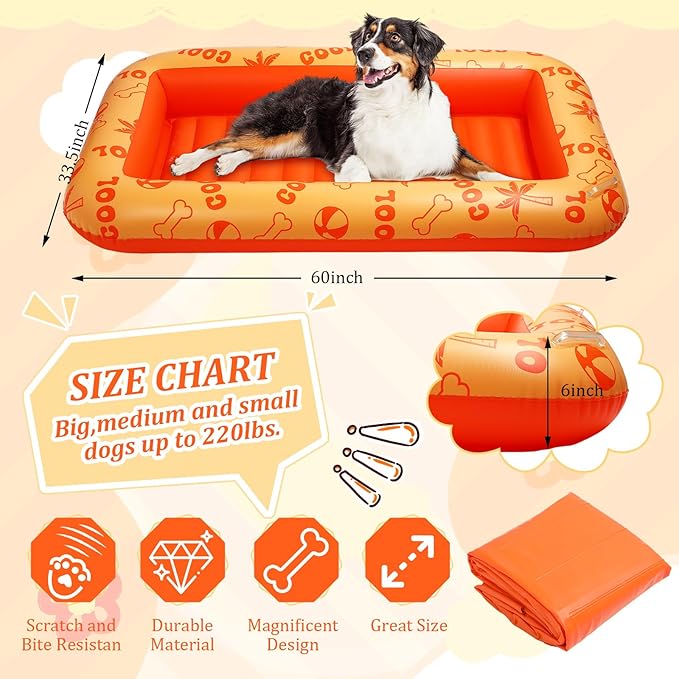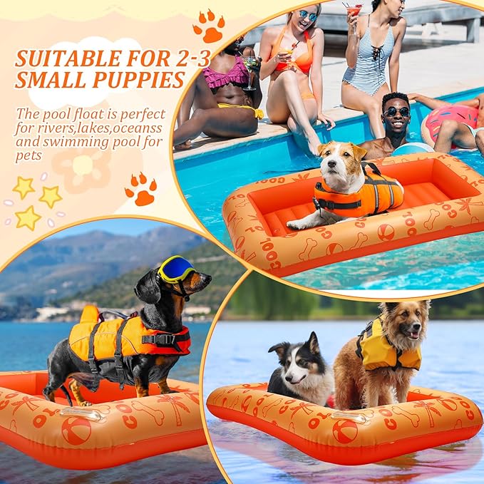 - Dog Pool Floats: the size of this puppy pool raft is about 60" x 33.5" x 6" , inflatable dog pool float is suitable for different types of pets, even adults can play on it, dogs can enjoy the cool water while lying on it, applied as a dog float for rivers, lake raft for large dogs, dog raft for lakes