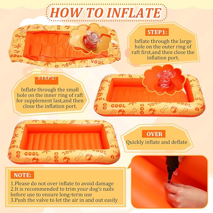 - Easy to Use: simply inflate the pet pool raft's 2 air chambers, connect to the air pump and inflate to approximately 95%; Then close the inflation valve; Let it float, and when not in use, simply deflate and fold into a compact size for storage, air pump is not included