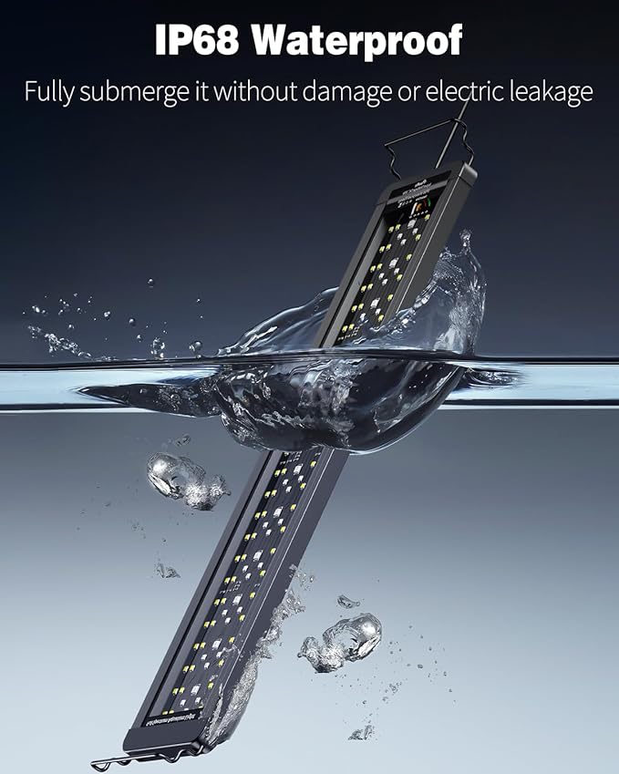 - D/N Mode: Customize the daytime and night working hours with the IP68 waterproof fish tank light. Daytime duration: 6 h, 8 h and 10 h; Night duration: 2 h, 3 h and 4 h. Simulate the daylight and moonlight to create a natural environment.