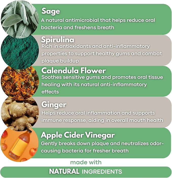 - [Less Fillers, More Function]: Made with 5 natural ingredients, sage, spirulina, calendula flower, ginger and apple cider vinegar, and without artificial fillers commonly found in other dog dental treats, DentalMelts provide only the essential ingredients to support oral health and freshen breath, ensuring the best for your pup.