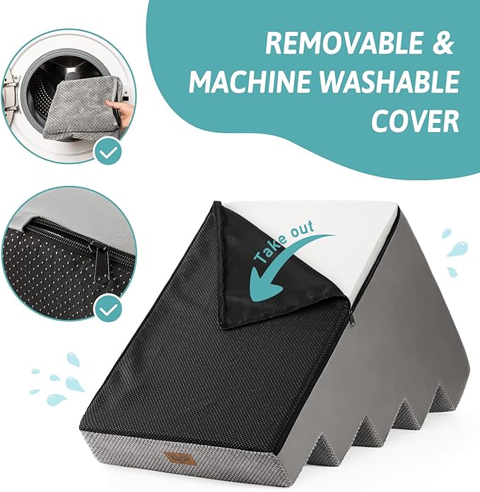 - Non-Slip Base and Removable Cover: Our dog steps for beds are equipped with a non-slip base featuring rubber dots for additional grip, minimizing movement during use. The pet steps cover is waterproof on the inner side, so you don’t have to worry about stains seeping into the foam. The outer cover is removable and machine washable for easy cleaning