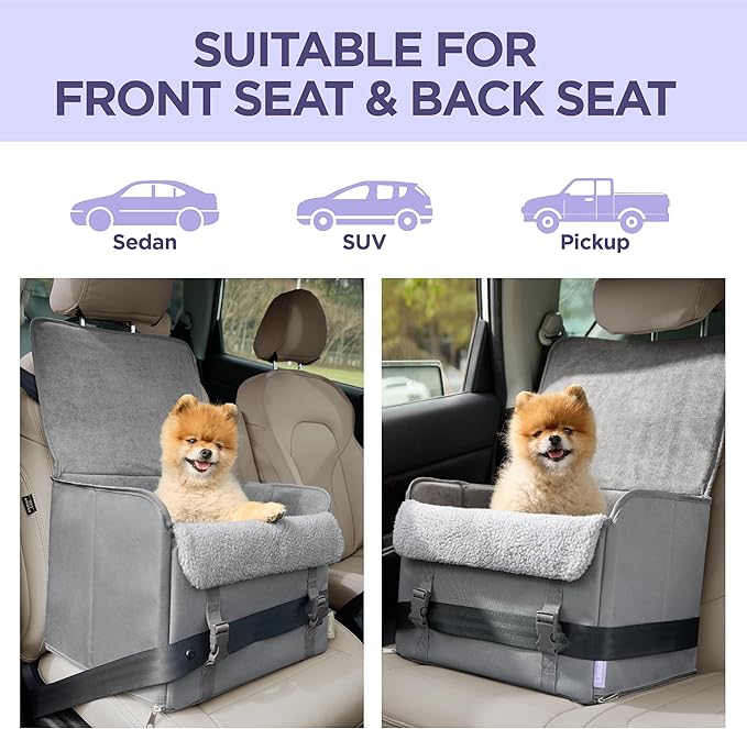 - Safety & Seat Protector: With your pet’s safety as our top priority, the dog car seats for small dogs includes patent buckles and an adjustable clip-on leash. These features secure the pet car seat in place and prevent your pet from jumping out, allowing them to stay comfortable and secure without distracting the driver.In addition, the seat protector on the back will protect your seat from being scratched by your pet.