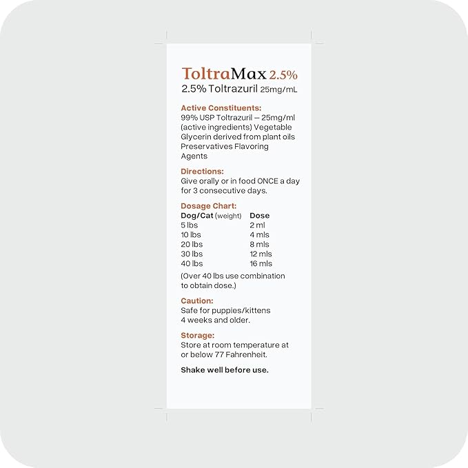 - Contains (1) 60mL/2 Ounce ToltraMax Toltrazuril 2.5% for Horses, Dogs, Cats