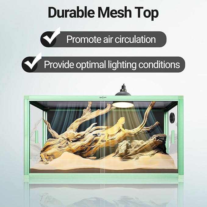 - Versatile Top Mesh & Cable Management: The top screen ventilation not only ensures proper air circulation but also supports the use of heating lamps or UVB lights, crucial for the health of your reptiles. The side cable pass provide a clean and organized way to manage cables from accessories like filters, heaters, and lights, keeping the enclosure looking tidy and your reptiles safe.