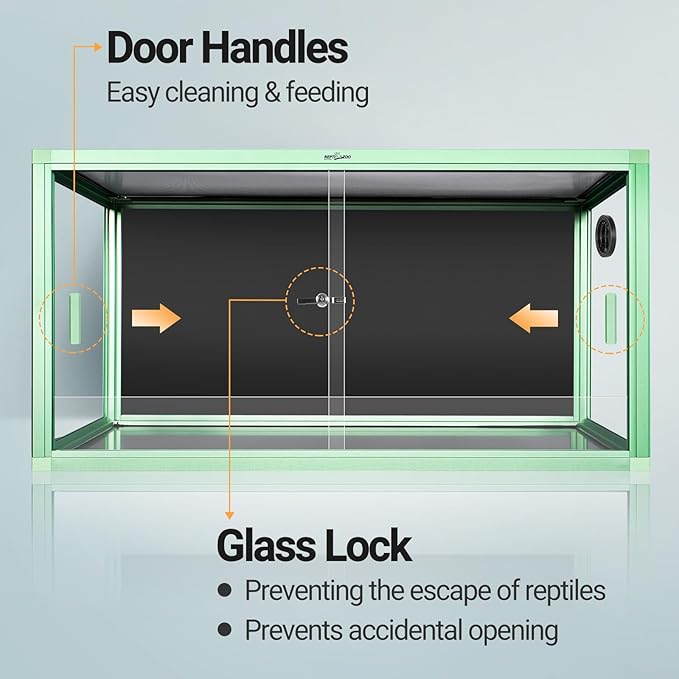 - Secure & Accessible Front Opening: Equipped with dual sliding doors on the front, this glass cage features a metal lock for added security. This design not only makes it convenient for daily feeding and maintenance but also effectively prevents your reptiles from escaping and protects curious children from accidentally opening the doors.