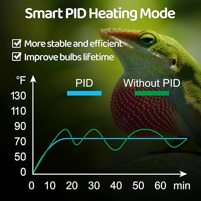 - 【Dimming Thermostat】This reptile thermostat specifically designed for controlling heat lamps, smart PID heating mode is more stable and efficient which can improve bulb lifetime. It's also great for heating pad. (Not applicable to sunlamp, LED lamps, energy-saving bulb)