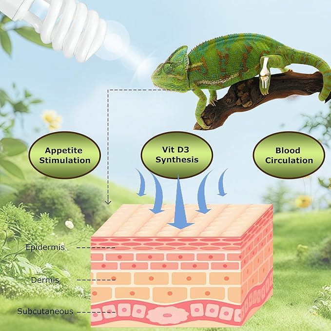 - Wide Applications – This bulb is perfect for a wide range of tropical and subtropical reptiles and amphibians, including chameleons, turtles, lizards, geckos, frogs, tortoises, snakes, and more. It fits standard E26 lamp sockets (120V), making installation and replacement easy. For optimal performance, we recommend replacing the bulb every 6 to 12 months to ensure consistent UVB output.