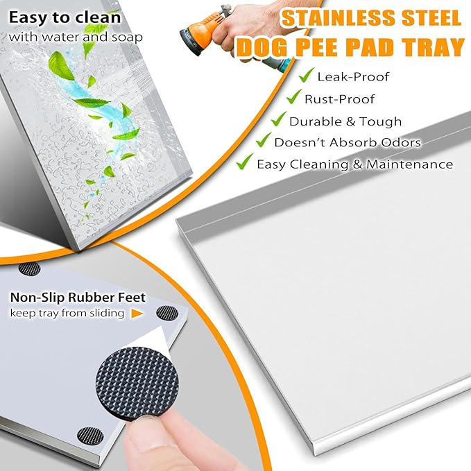 - 【Stainless Steel Tray】 This dog grass pad with Tray is made of heavy duty industrial grade 304 stainless steel, boasting a service life of 5-8 years (ordinary plastic trays typically yellow and deform within 6 months). The reinforced steel frame prevents warping, even under large dogs weighing up to 250 lbs. Compared to plastic, making it ideal for households with pets prone to skin sensitivities.
